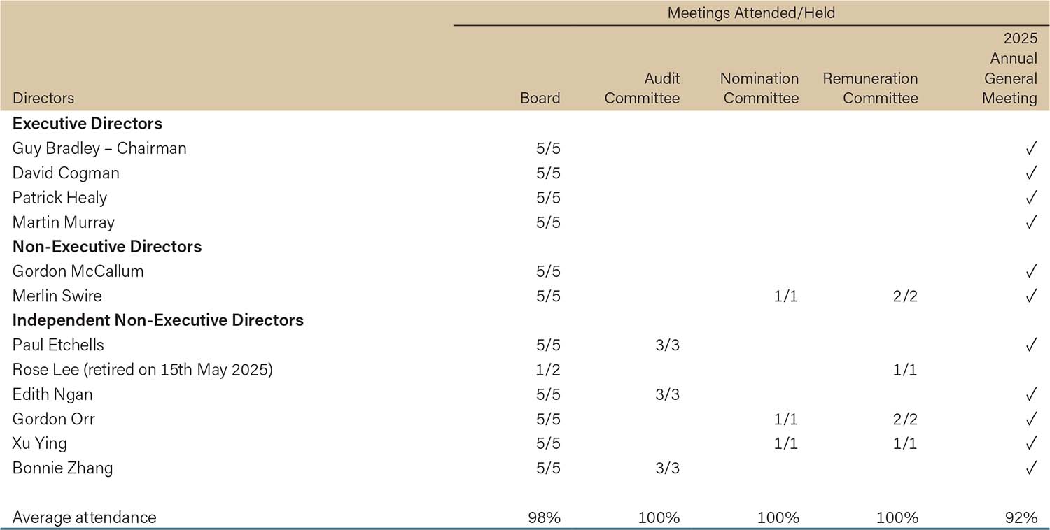 The Board met five times in 2025, including a strategy session. The attendance of individual Directors at meetings of the Board and its committees is set out in the table below. Average attendance at Board meetings was 98%. All Directors attended Board meetings in person or through electronic means of communication during the year.
