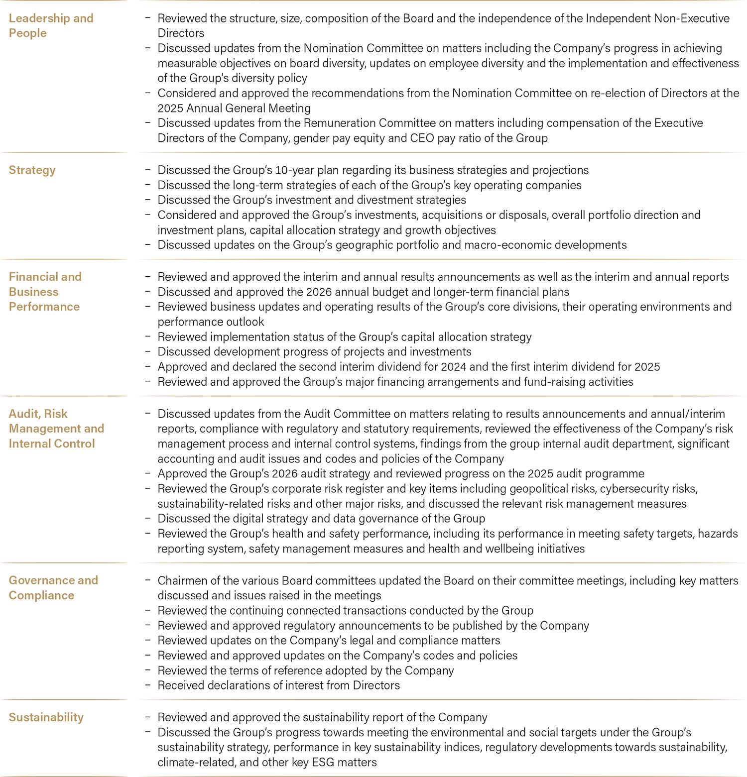 Directors meet at least once annually to discuss the Company’s strategy, including investment and divestment plans and other strategic initiatives. The strategy session also serves as a platform for raising new initiatives and ideas.