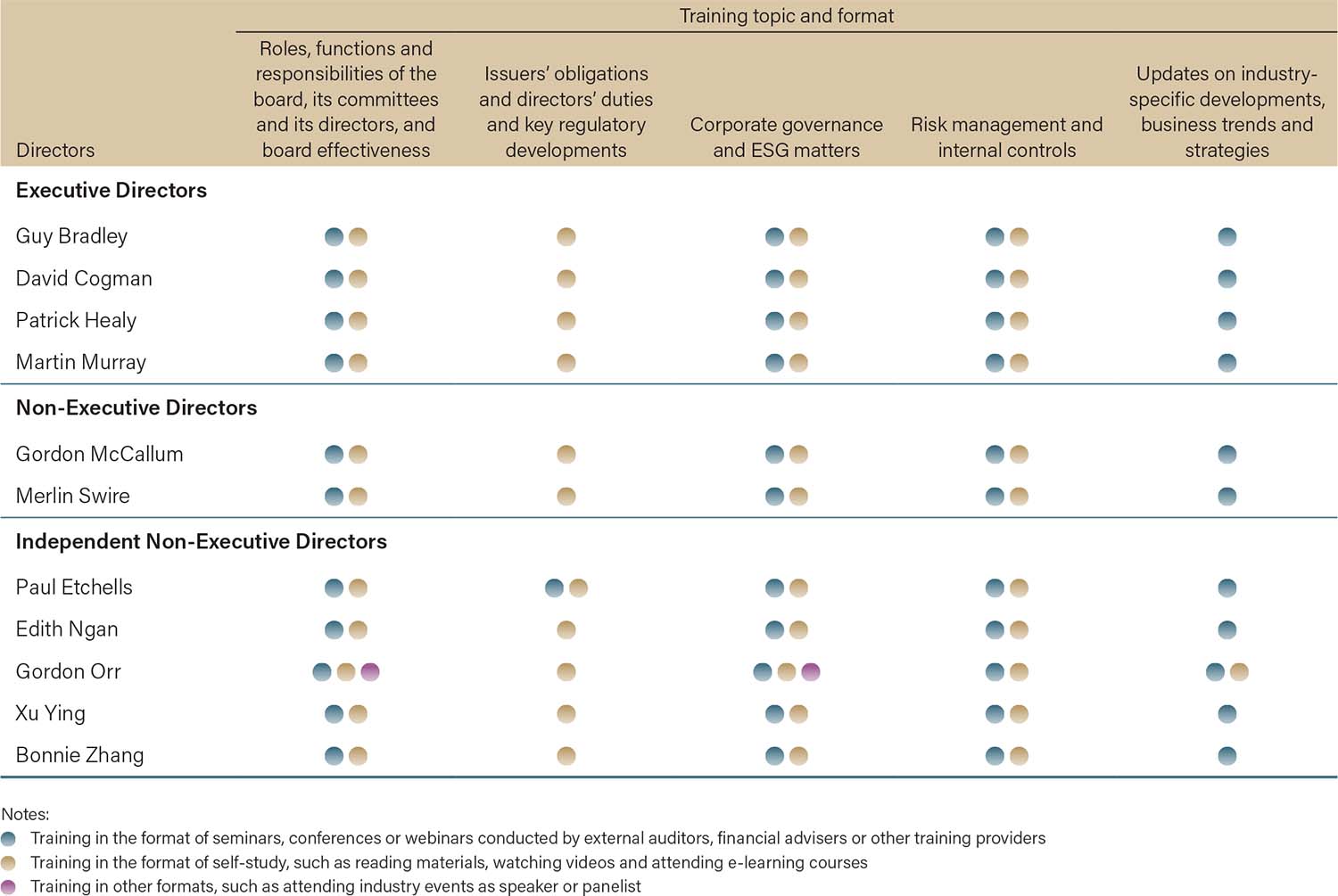 Directors have provided the Company with their training records. During 2025, each of the current Directors has participated in continuous professional development as required under Rules 3.09F and 3.09G of the Listing Rules, covering topics identified in the table below: