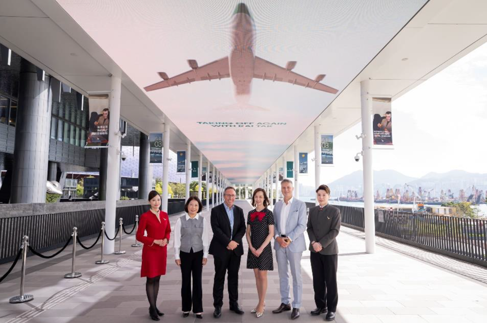 Cathay Chief Customer and Commercial Officer Lavinia Lau (third from right), Kai Tak Sports Park Chief Executive Officer John Sharkey (third from left), Cathay General Manager Brand, Insights and Marketing Communications Edward Bell (second from right) and Kai Tak Sports Park General Manager of Commercial Sales & Corporate Partnerships Katherine Chow (second from left) celebrated the launch of Cathay’s “Taking off Again with Kai Tak” at West Bridge.