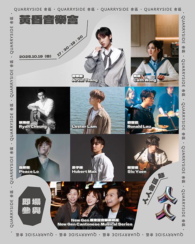 The highlight of the Festival is the Sunset Music Show, to be held on 19 October at 5:30pm. The line-up includes singer-songwriter Cath Wong; up-and-coming singer Arvin Tsang; independent singer-songwriter and guitarist Ryan Cheung; independent singer-songwriter Lester Lam; singer-songwriter Siu Yuen; singer-songwriter Peace Lo; independent singer Hubert Mak; keyboardist Ronald Lau; and the New Gen Cantonese Musical Series. This exciting line-up of up-and-coming Hong Kong music talents will gather at Quarryside and showcase a variety of musical genres.