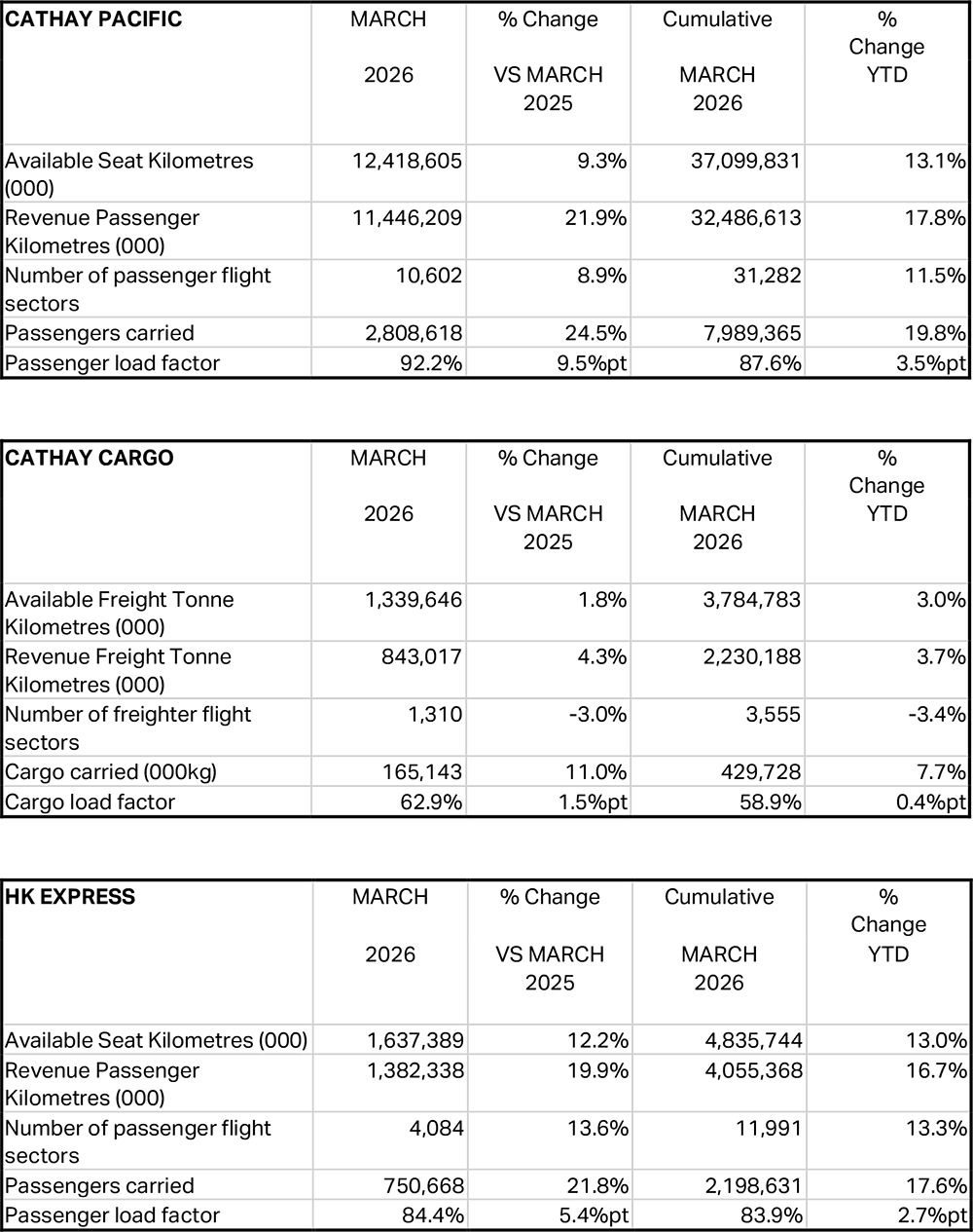 The Cathay Group today released its traffic figures for March 2026.