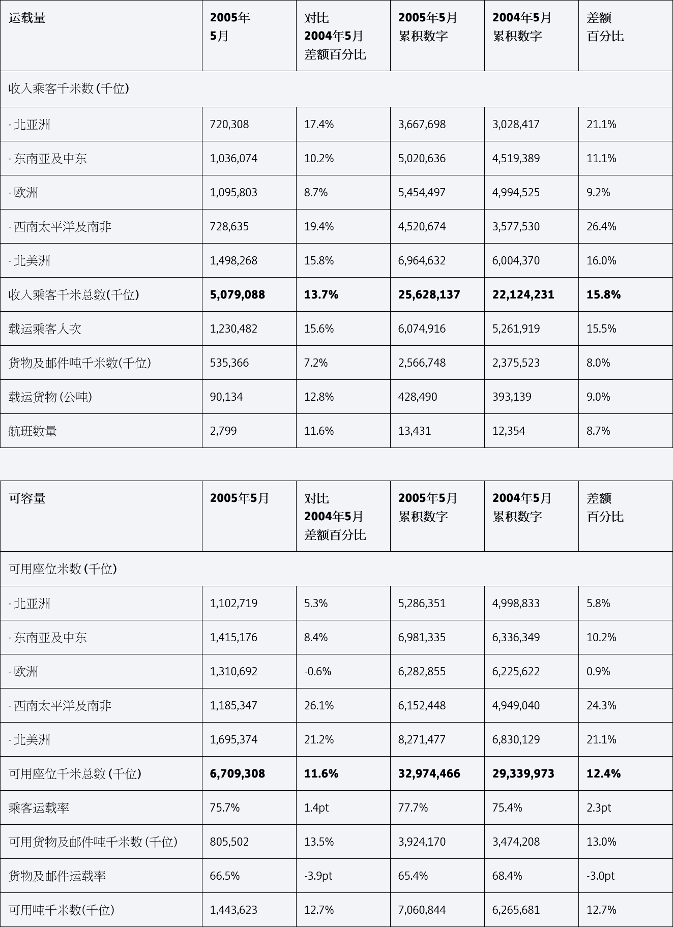 国 泰 航 空 二 零 零 五 年 五 月 份 的 载 客 量 及 载 货 量 均 因 运 力 提 升 而 持 续 录 得 稳 步 增 长 。