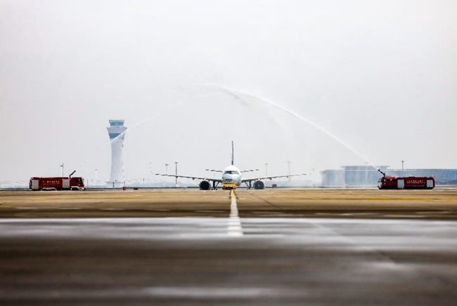 长沙黄花国际机场以「过水门」仪式迎接首航的 CX968航班。