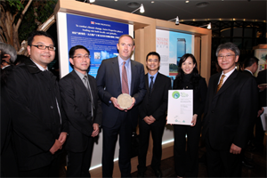 太古地产代表香港区常务总裁香港白德利﹝左三﹞、高级经理邵婉仪﹝右二﹞和技术统筹及可持续发展总监陈永康﹝右一﹞代表太古地产又一城于环保建筑大奖2010 颁奖礼上获颁发既有建筑类别(香港及亚太地区)大奖。
