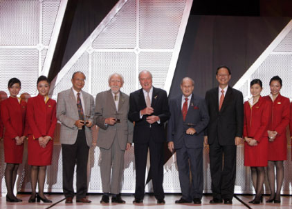 香 港 特 区 行 政 长 区 曾 荫 权 ( 中 ) 、 国 泰 航 空 主 席 白 纪 图 ( 左 ) 、 国 泰 航 空 行 政 总 裁 陈 南 禄 主 持 揭 幕 仪 式 , 正 式 为 “ 国 泰 航 空 60 周 年 庆 祝 晚 会 ” 揭 开 序 幕 。