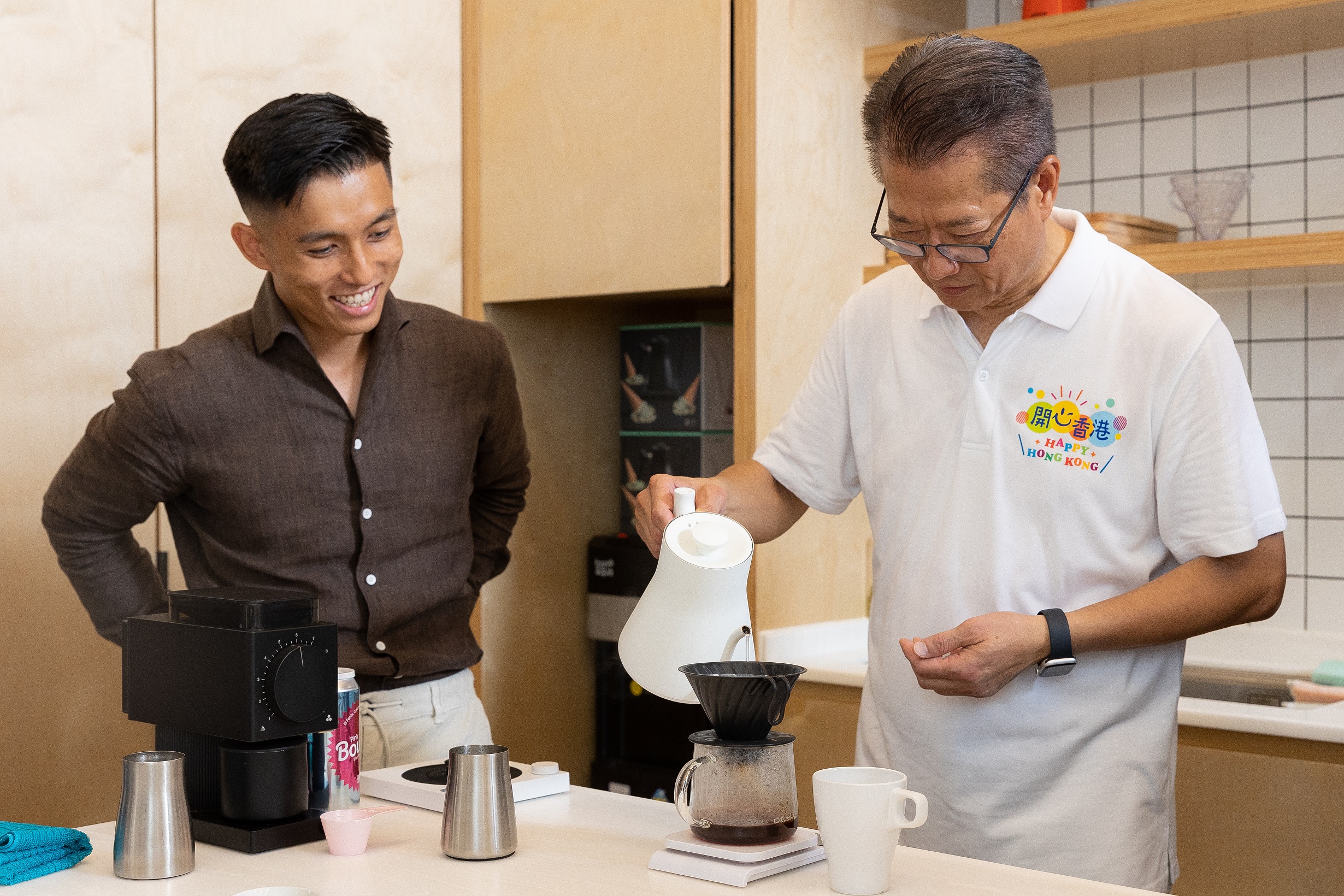 财政司司长陈茂波先生(右)与“舍区”咖啡店年轻创业者(左)一起进行手冲咖啡。