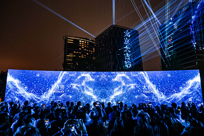 到场宾客齐聚北京太古坊,共同欣赏绚烂的夜间灯光秀。