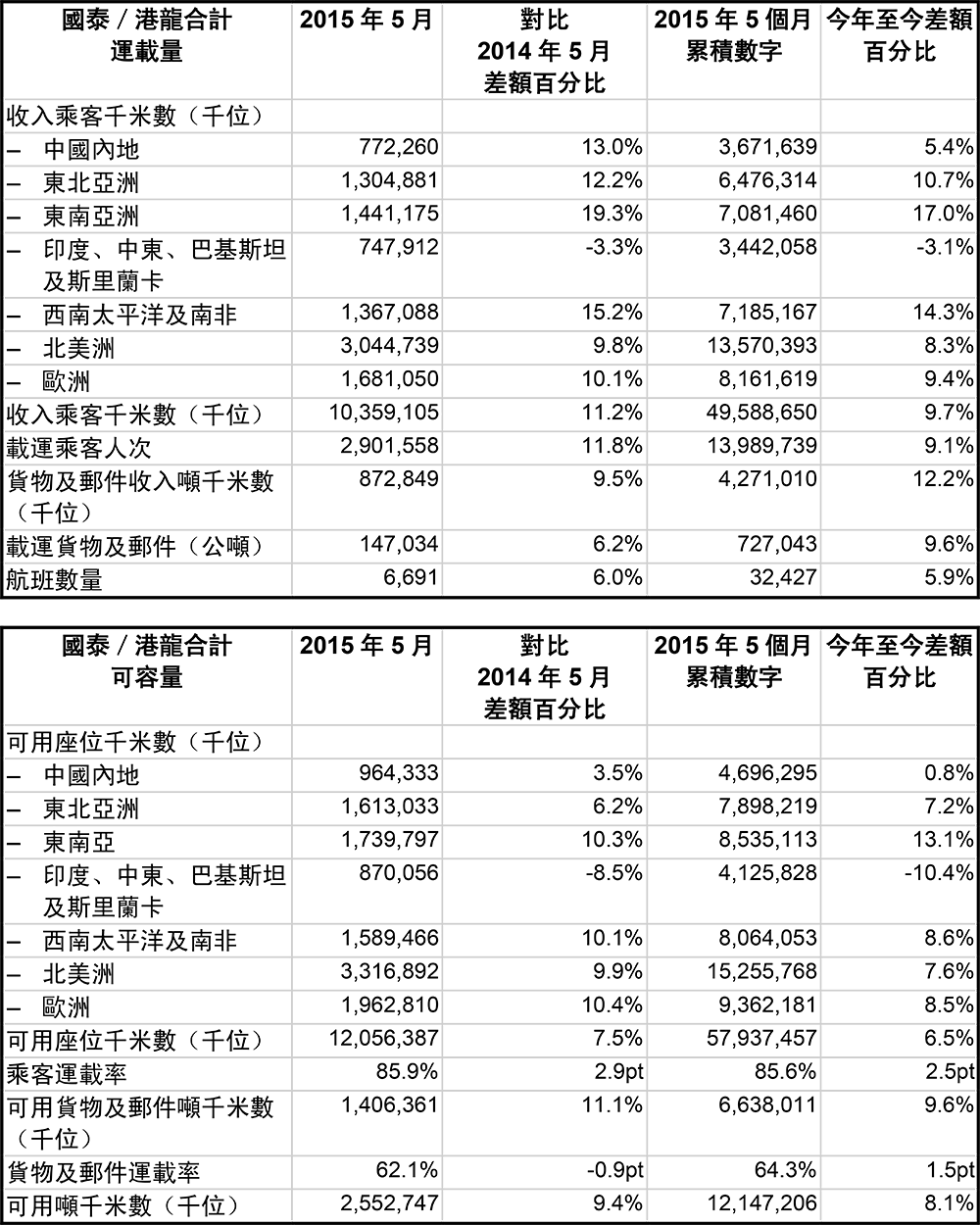 國泰航空今天公佈與港龍航空2015年5月份合併結算的客、貨運量。數據顯示,5月份的載客量以及貨物及郵件運載量較去年同期均錄得增長。