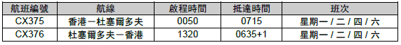 備註: 所有時間均為當地時間。航班編號及時間有待相關機構批准,或會有臨時變動;客機型號亦可能因運作需要而有臨時變動。